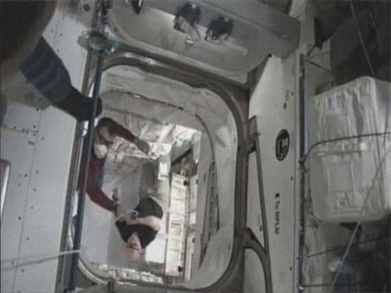 こうのとり2号機のキャリア与圧部に入室する国際宇宙ステーションクルー
